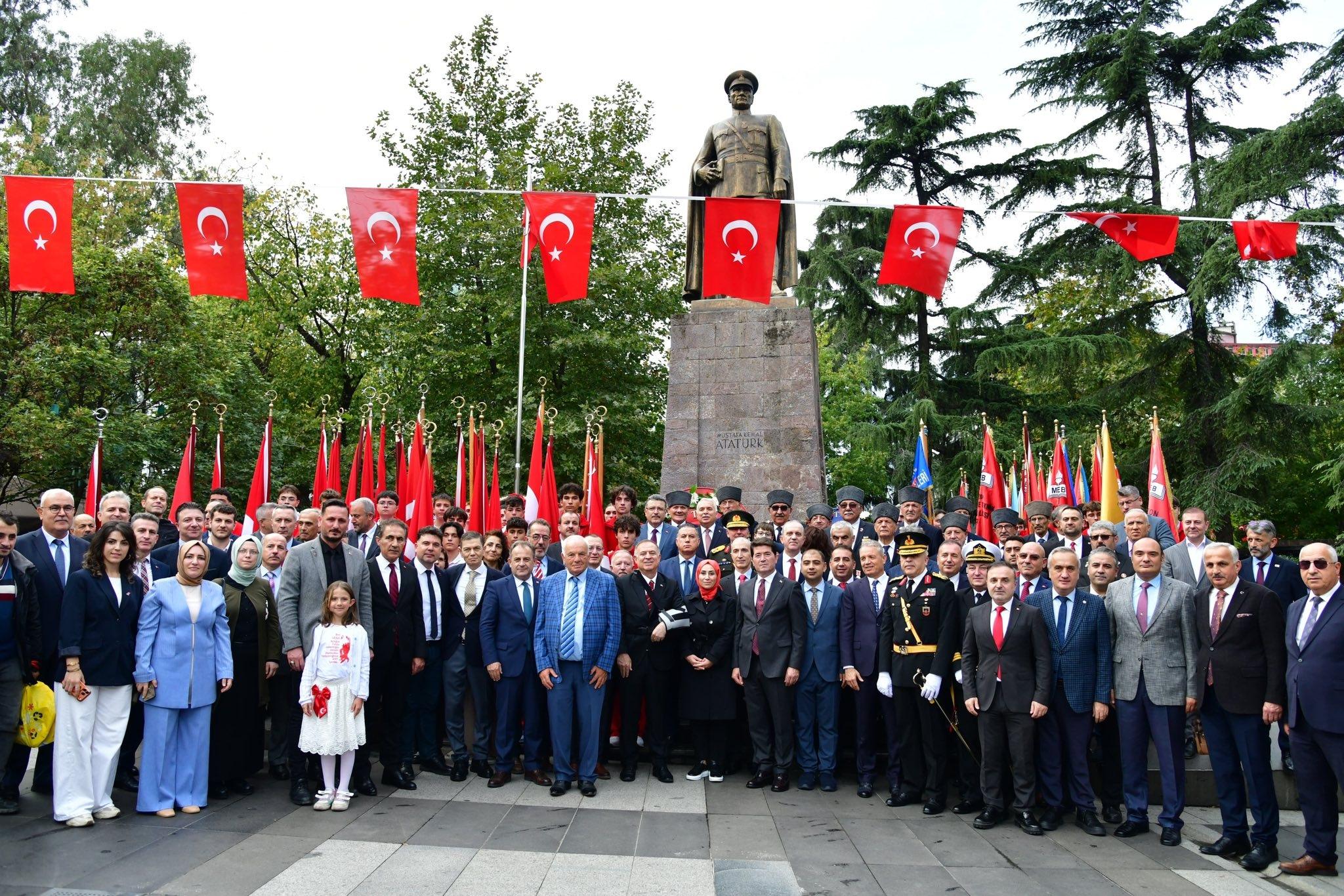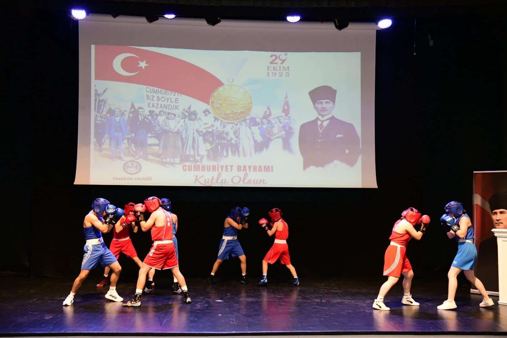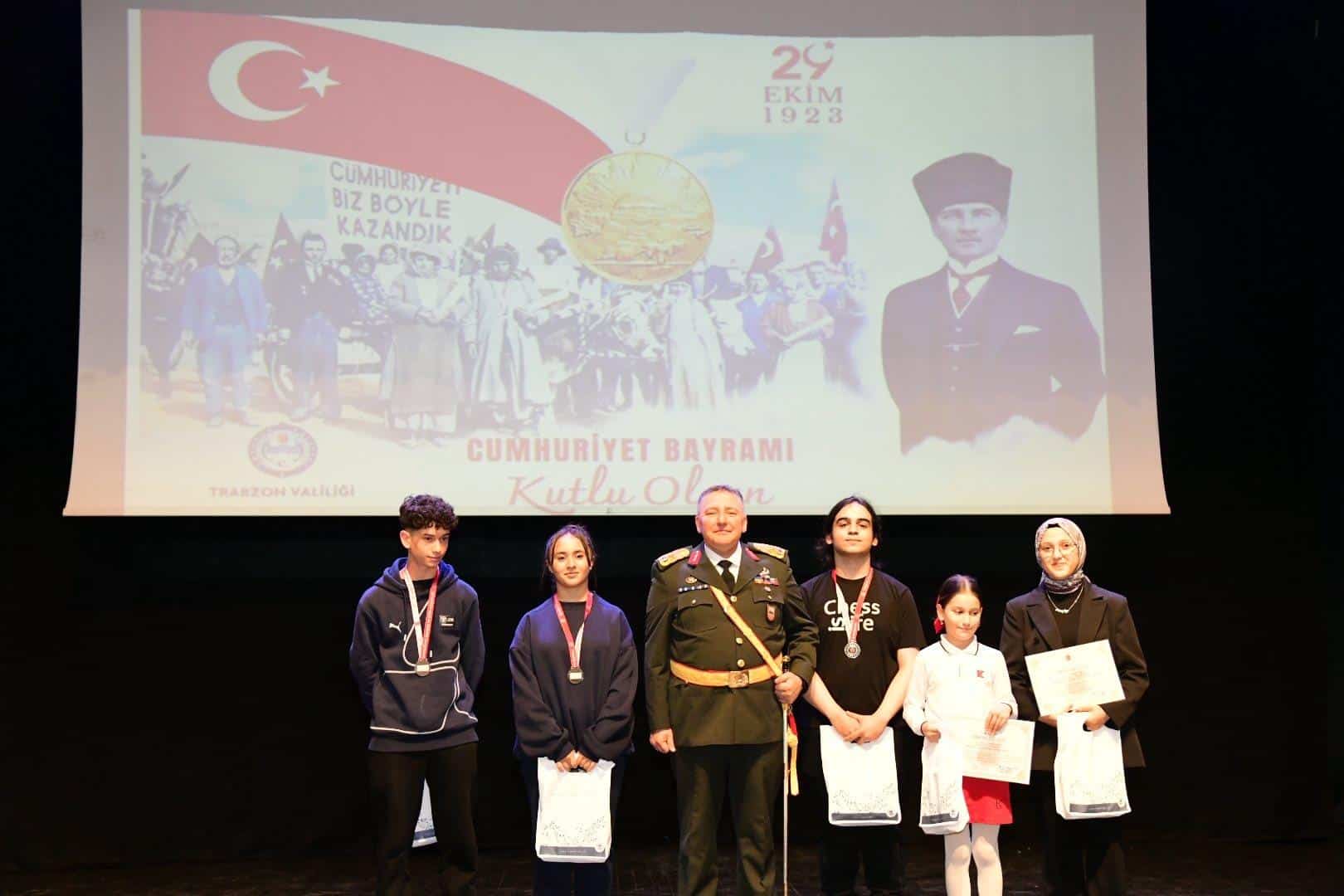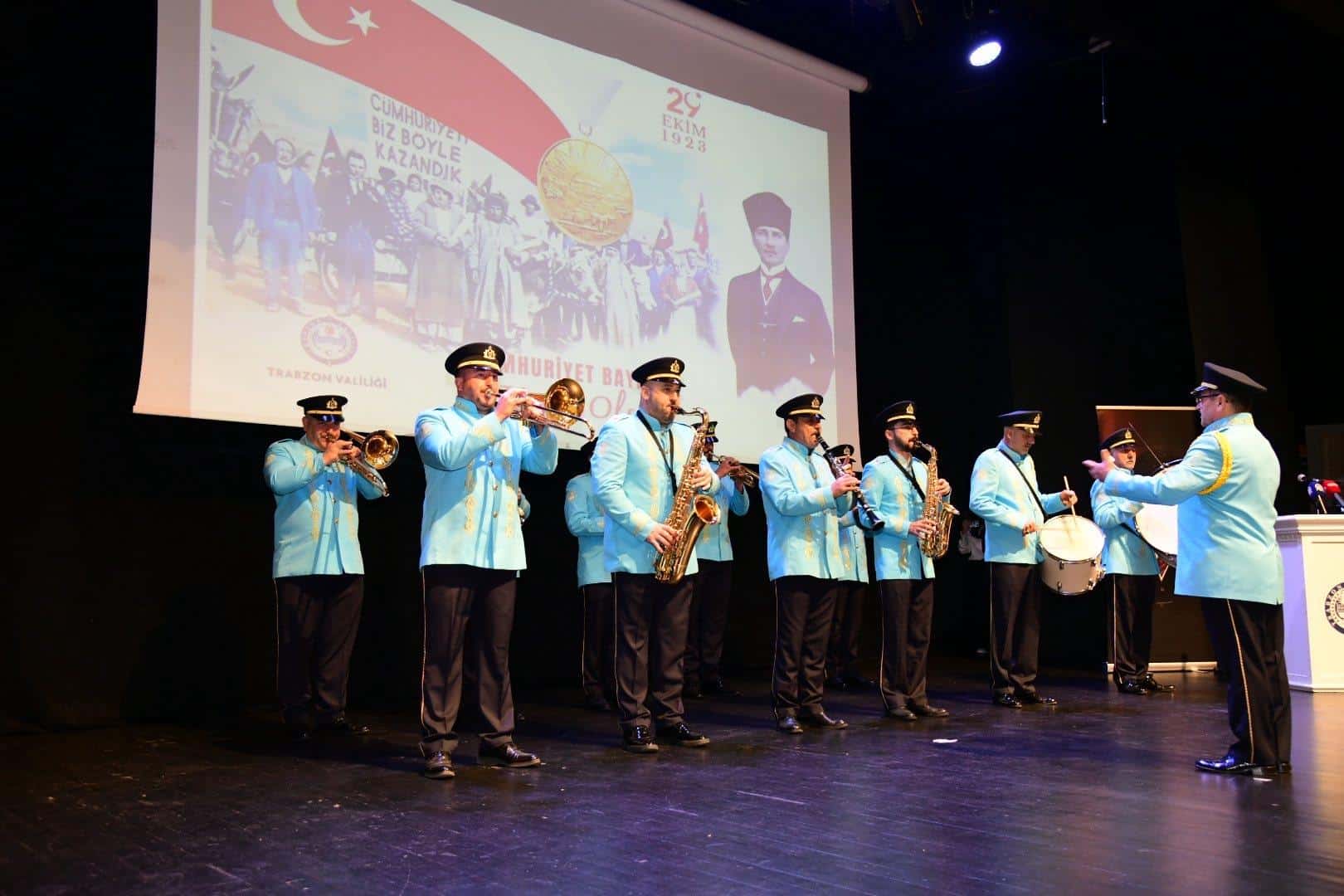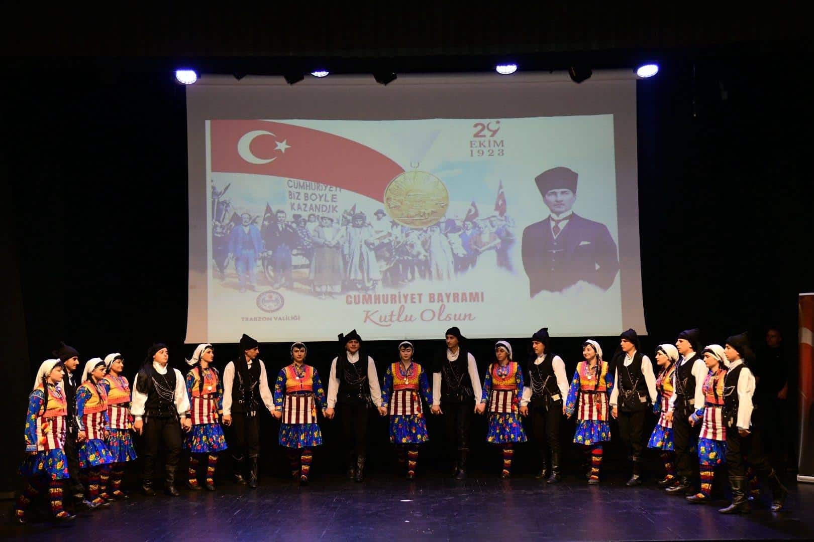 Valilik Makamı'nda, Trabzon Valisi Aziz Yıldırım'ın ev sahipliğinde, tebriklerin kabulü ile başlayan 29 Ekim Cumhuriyet Bayramı Kutlama Programı, Hamamizade İhsanbey Kültür ve Sanat Merkezi'nde, Vali Aziz Yıldırım, Garnizon Komutanı Tuğgeneral Mehmet Zeki Eren, Trabzon Büyükşehir Belediye Başkanı Ahmet Metin Genç, askeri ve mülki erkân, siyasi parti temsilcileri, İl Millî Eğitim Müdürümüz Hasan Uygun, diğer kurum müdürleri, sivil toplum kuruluşları, şehit yakınları, gaziler, öğrenciler ve vatandaşların katılımıyla devam etti.